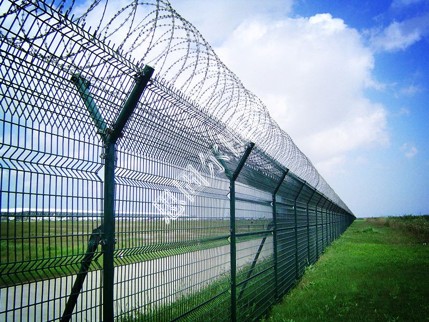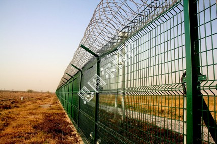 :如果在飛機場圍欄頂部加裝刀片刺絲、刀片刺繩后又很好的增強了安全防護性能。采用電鍍、熱鍍、噴塑、浸塑等防腐形式,具有很好的抗老化、抗曬、耐候等特點。其產品造型美觀、花色多樣,既起到圍欄作用,又起到美化作用。由于具有安全性高、防攀爬能力好,網片連接方式采用特制SBS緊扣件,有效防止人為的破壞性拆卸,橫向四道折彎加強筋,使網面強度顯著增加。