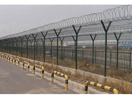 飛行區(qū)鋼筋網(wǎng)圍界網(wǎng)面是由直徑5mm的鋼筋排列成矩形網(wǎng)格點(diǎn)焊形成,相鄰橫筋間距不大于10cm,相鄰豎筋間距不大于5cm.每片鋼筋網(wǎng)片寬度不大于3m,用螺栓固定在事先埋設(shè)好的立柱上.為增加圍界的穩(wěn)定性,一般每30m左右增加一個(gè)斜撐.圍界上部50—60cm以30.一45.角向外傾斜,或設(shè)置滾筒形刺鐵絲網(wǎng)防止攀越。