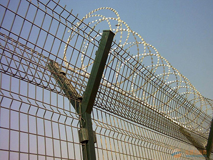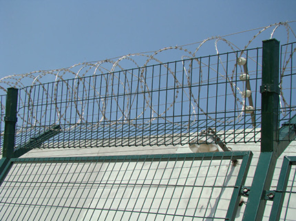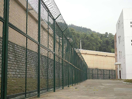 監(jiān)獄防護網主要是采用高強度的刀片刺網與普通防護網的結合,由V型支架立拄,加強型焊接片網,安全防盜連接件和刀片刺網組成.刀片刺網是一種新型防護網,由銳利尖角鍍鋅鋼板或不銹鋼薄板做刀片,鋼絲做芯線組合而成的防護器材。
